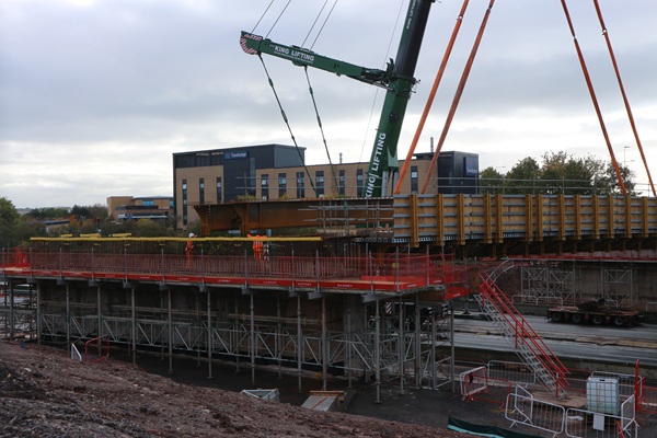 The first two beams of the new £20 million bridge were in place by 7am today, with the second pair put into place around 11am.